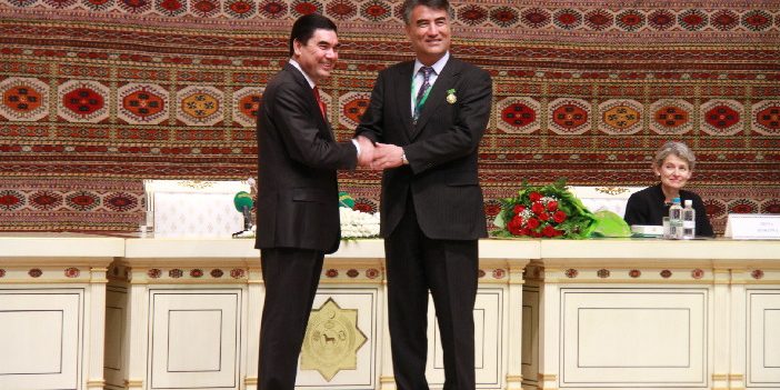 Tashpolat Tiyip accepting an award from the president of Turkmenistan, Gurbanguly Berdimuhamedow, for his work to promote international literature and exchange. (Source)