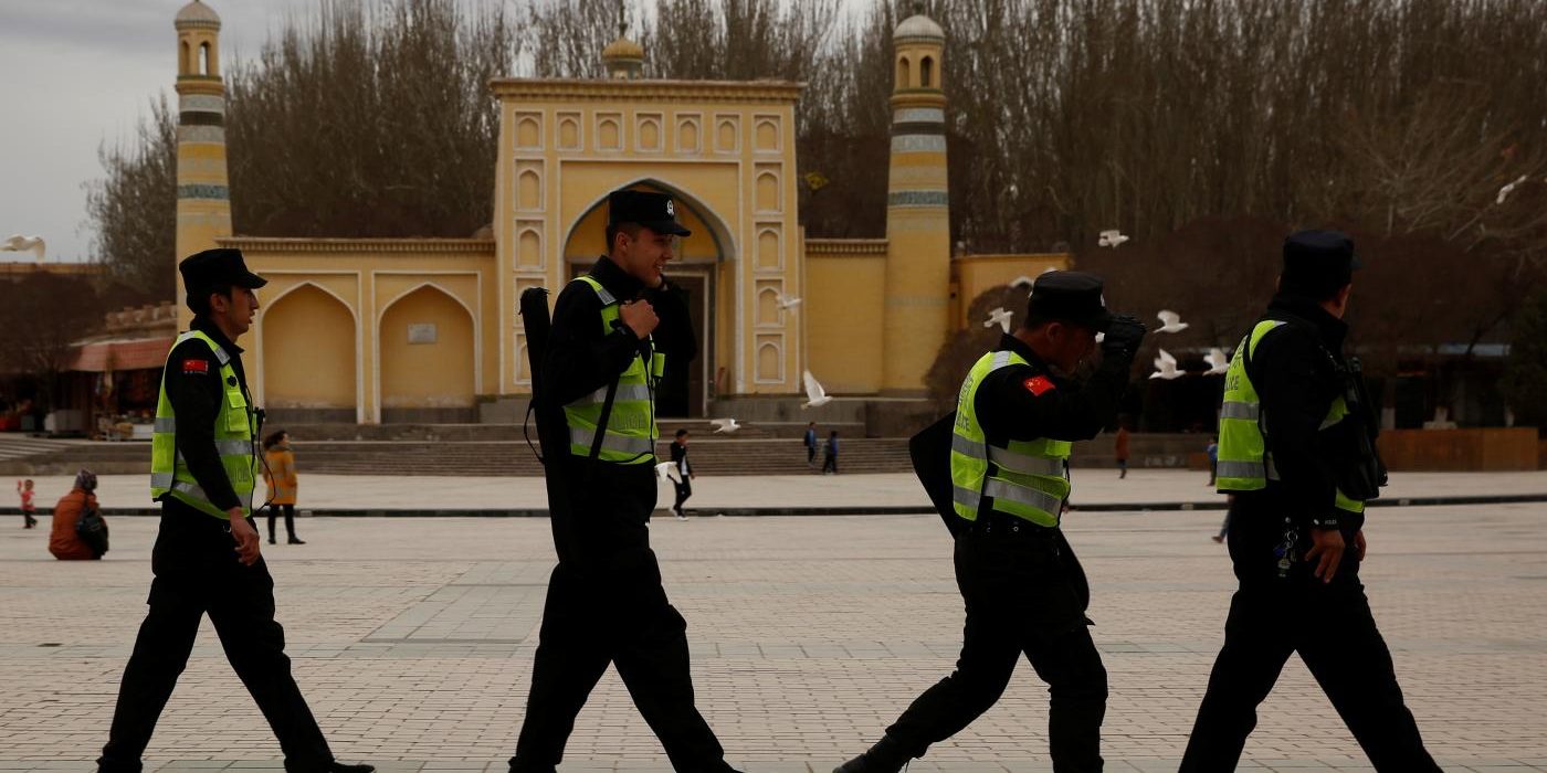 A police officer talks to men in a street in Kashgar, Xinjiang (East Turkistan) Uighur Autonomous Region, China, March 2017.